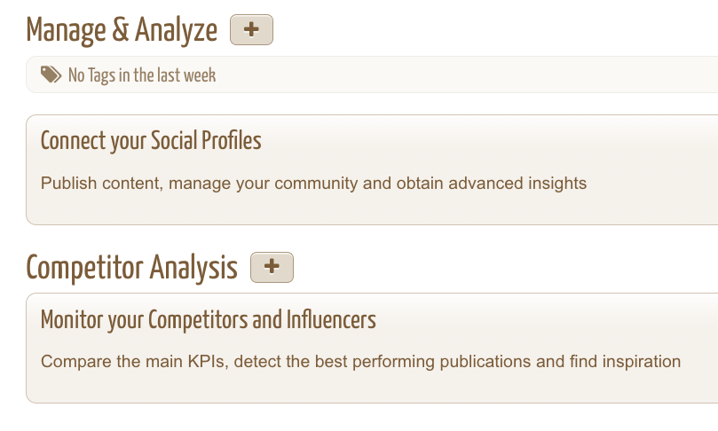 - Manage & Analyze: to connect a Social Profile that you own you are required to be administrador of the page/account. You will get access to the full set of private data/analytics and functions of community management like publishing/scheduling posts or handling conversations. For more details about the installation of a connected Social Profile, click here.
