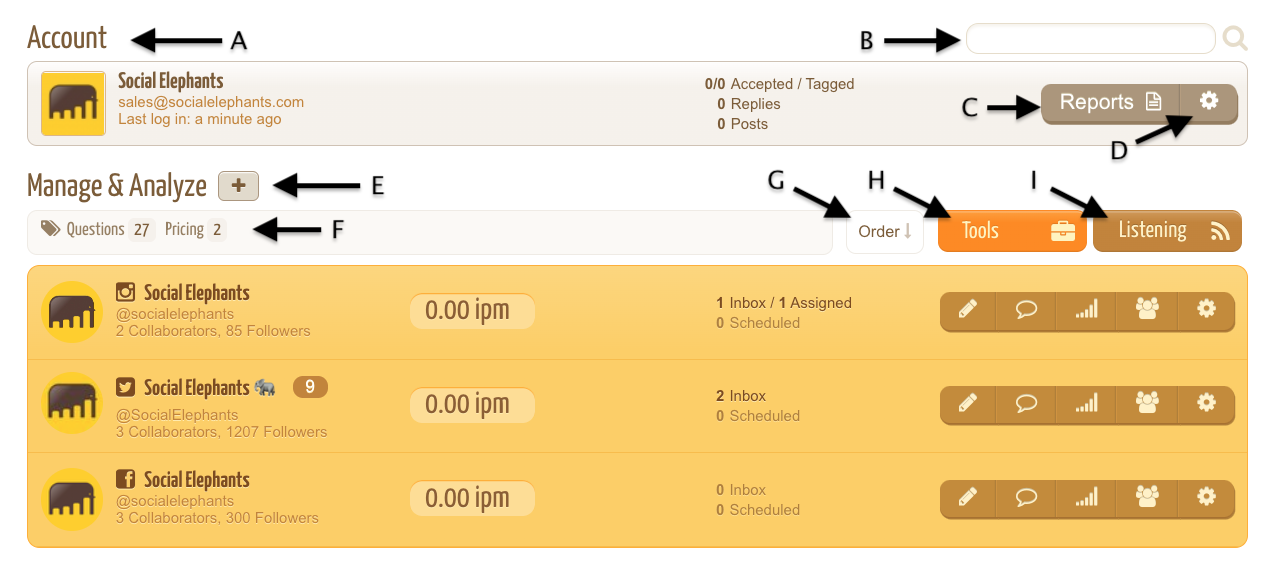 G. ORDER: you can rank your Social Profiles by Name, Community size (Followers), Interactions and Inbox (pending comments/messages).