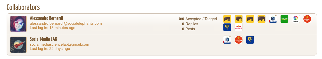On the dashboard the administrator can get an overview of the users collaborating on the different Connected Social Profiles or with access to some Competitor Analysis modules. The indicators displayed on the screen report the recent activity of each collaborator. The icons on the right identify the Social Profiles assigned to each collaborator: by clicking on them you can quickly access to the settings to manage the roles of the collaborators or revoke their access.