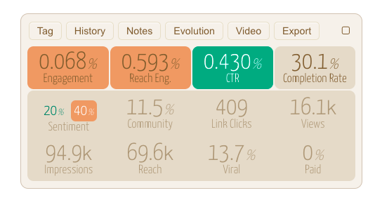The EVOLUTION tab is particularly useful to explore all the available post metrics and monitor their evolution in the hours/days after the publication.