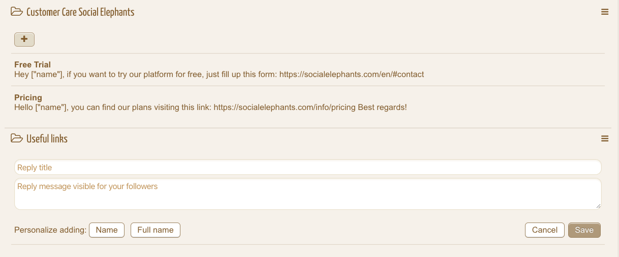 To configure a new Saved Reply we just need to insert a short "Reply title" and the actual text (reply message visible for your followers) that will appear in the social networks. In order to personalize the answers we offer the option to automatically insert the "Name" or "Full name" of the author of the comment/message that we are replying to.